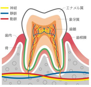 歯髄には神経が通っており、温度や痛みなどの感覚を脳に伝えます。そのため、冷たいものや熱いものを感じたり、虫歯や外傷で痛みを感じることができます。